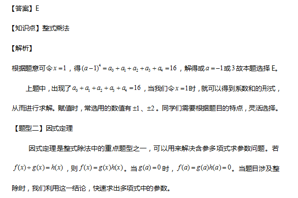 乘法中,如果题目中出现未知数系数和或差的形式时,则可以考虑赋值法即令未知数为某一特殊值,从而完成题目求解。