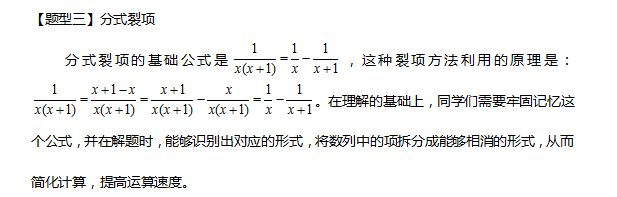 对于上面这道题目,如果使用直接通分的方法,运算量大,时间耗费多。显然,直接通分的方法不适用这道题目的求解。我们发现,需要求和的式子是多个分式相加的形式,这就是这道题的题眼,而分母中两项差1,符合分式裂项的基本公式。运用公式后,可以发现,拆分后,中间的项都可以抵消掉,可以快速完成计算。